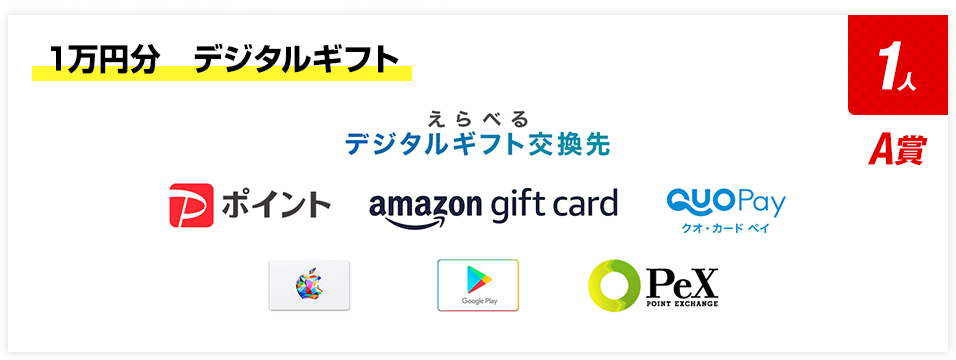 ※デジタルギフト:PayPayポイント・Amazonギフトカードをはじめ、ポイント交換サイトのPeXポイントギフトを選ぶと、LINEポイントや各社マイル、電子マネー、現金など6,000以上の交換も可能となります。