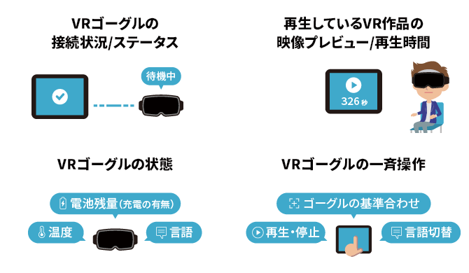 どこでもVR機器一式をお送りします。スタッフの派遣はございませんので、お客様ご自身でオンラインマニュアルを見てVR機器のセットアップをお願いします。VRゴーグル4台の場合、約1時間ほどVR機器のセットアップに要します。