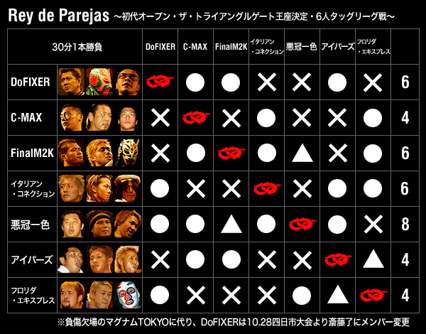 ※すべて30分1本勝負 勝ち=2点、負け=0点、時間切れ引き分け=1点、両者リングアウトや両軍反則などによる引き分け=0点