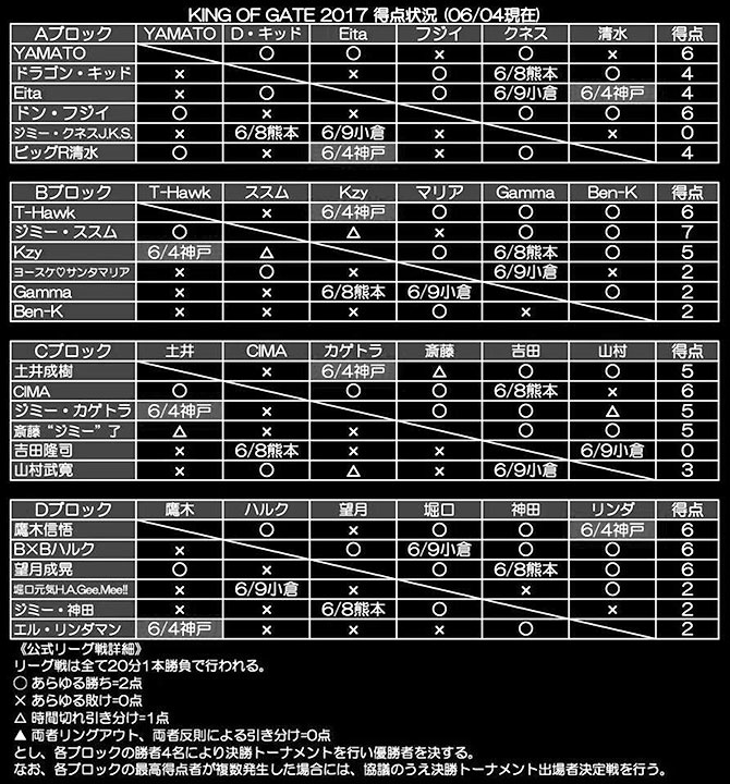 ※ジミー・クネスJ.K.S.の負傷欠場に伴い、今大会で開催予定でしたKING OF GATE 2017 A ブロック公式戦ドン・フジイvs ジミー・クネスJ.K.S.は、以下のとおりフジイ選手の不戦勝と致します。