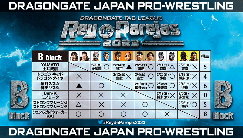 ・Bブロック=1位:シュン・スカイウォーカー&KAI(8点)/2位:望月ススム&神田ヤスシ(6点)