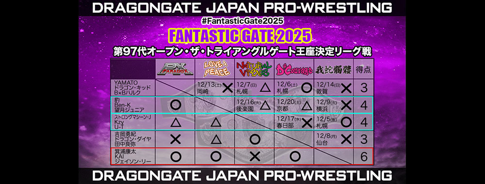 | メインイベント 第97代オープン・ザ・トライアングルゲート王座決定リーグ戦 |
