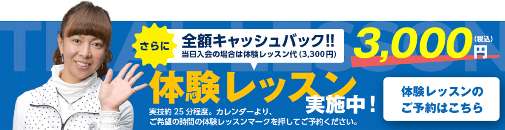 | 体験レッスン | 体験レッスン付きゴルフ力診断60分で3,300円(税込) |