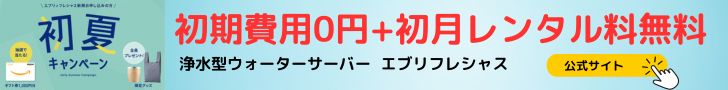 | 浄水型ウォーターサーバー エブリィフレシャス 2ヶ月無料キャンペーン | 水道水を注ぐ タイプ | 月額3,300円~ | 家庭の水道代 | - | 浄水 | あり | 水道水を注ぐだけで使える定額制の浄水型タイプ 3サイズ・タイプから選べる | |