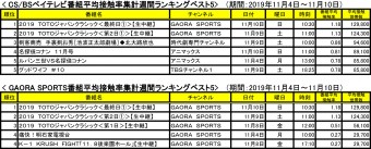 「2019 TOTOジャパンクラシック」を連日生中継したGAORA SPORTSは、株式会社ビデオリサーチが実施している《機械式ペイテレビ接触率共同調査》番組平均接触率集計週間ランキング※1において、対象期間の全チャンネル、全番組中1位、2位を獲得しました。(期間:2019年11月4日~11月10日)