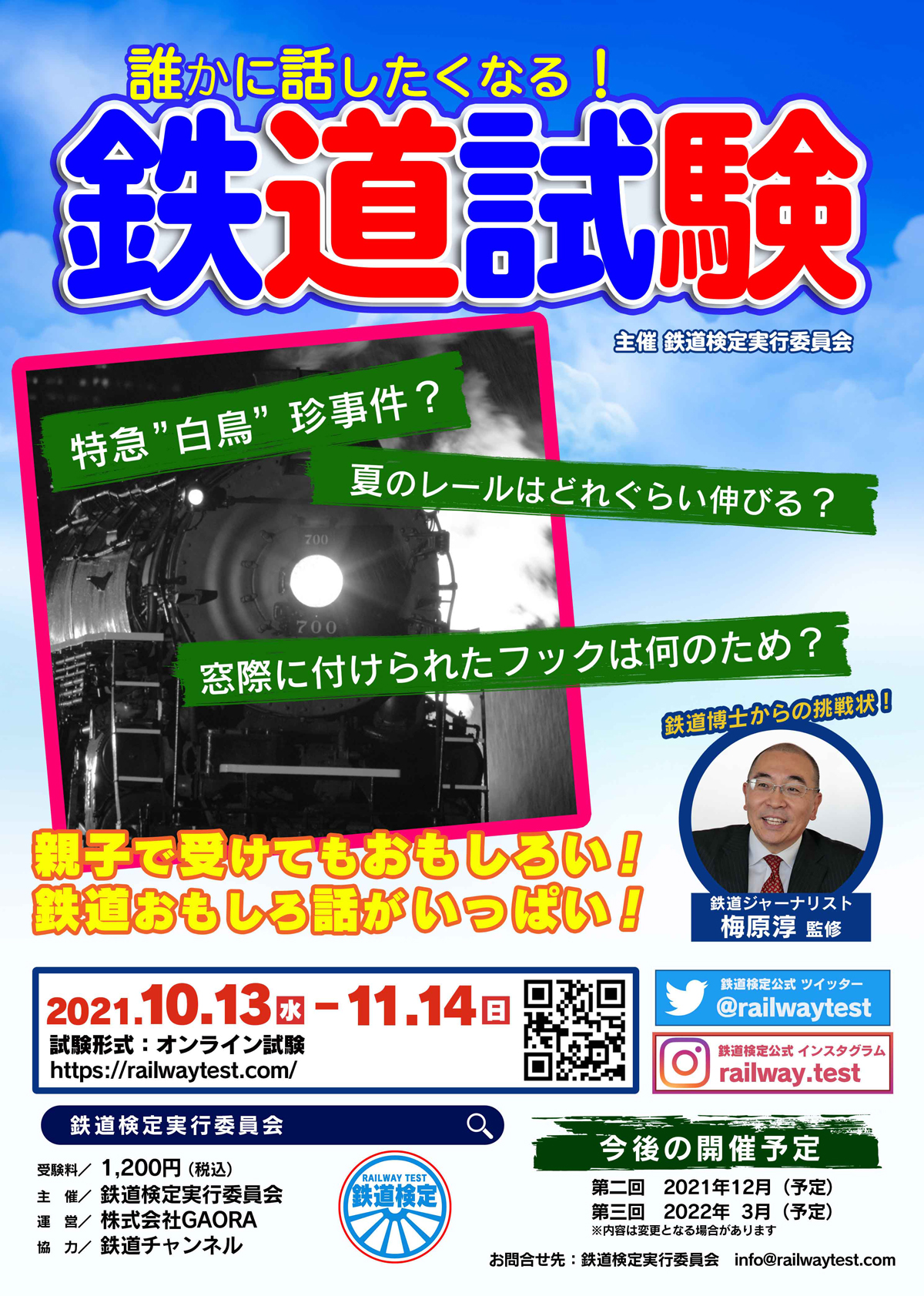 株式会社GAORA(本社:大阪市北区、代表取締役社長:竹田靑滋)は、2021年10月13日(水)からオンラインで受験可能な鉄道試験を開催します。問題作成および監修は人気鉄道ジャーナリストの梅原 淳氏が務め、第1回となる今回は「誰かに話したくなる!鉄道試験」と題した試験を行います。