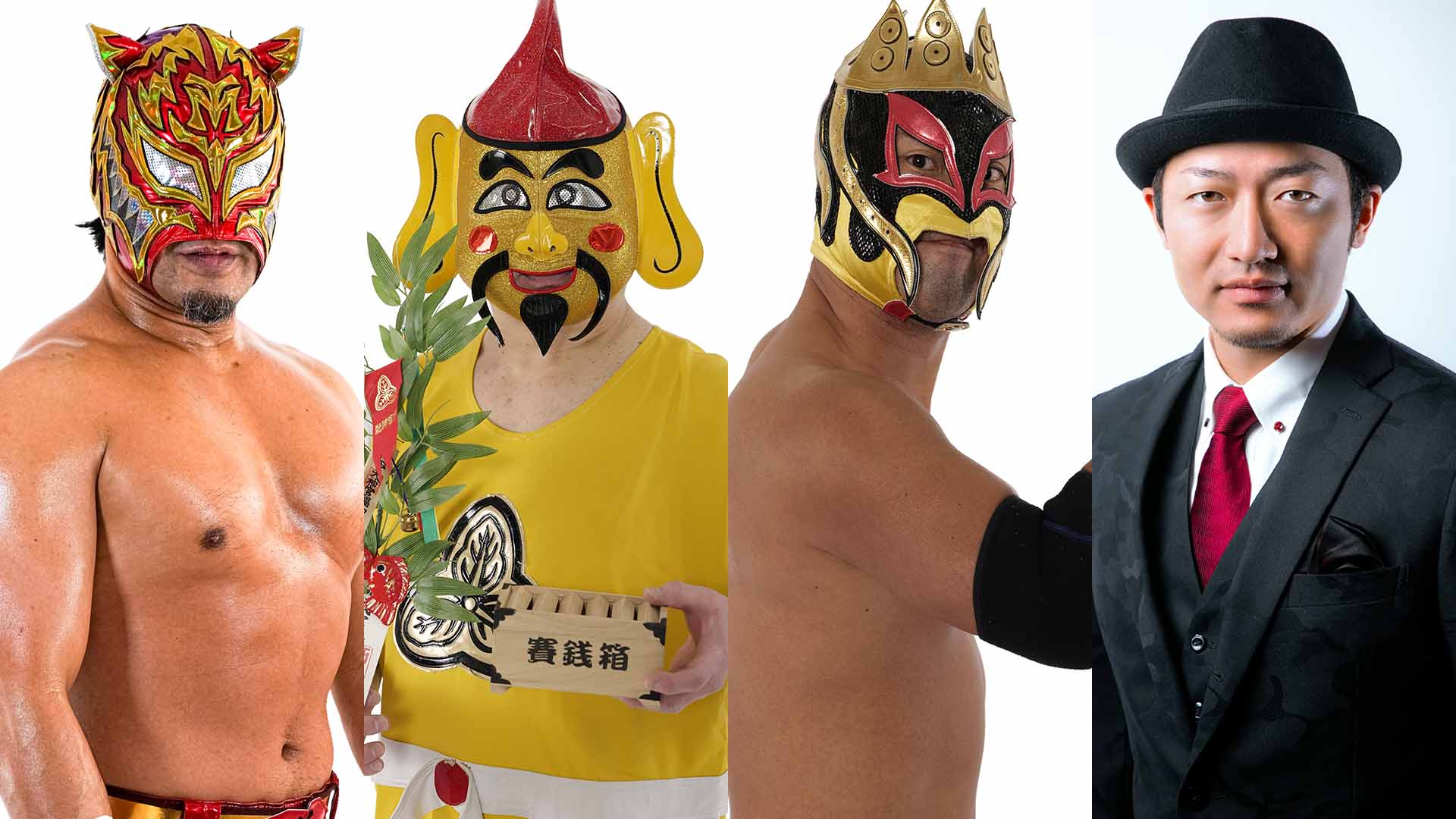 大阪プロレス・タイガースマスク、えべっさん、タコヤキーダー、宮尾信次郎(リングアナウンサー)