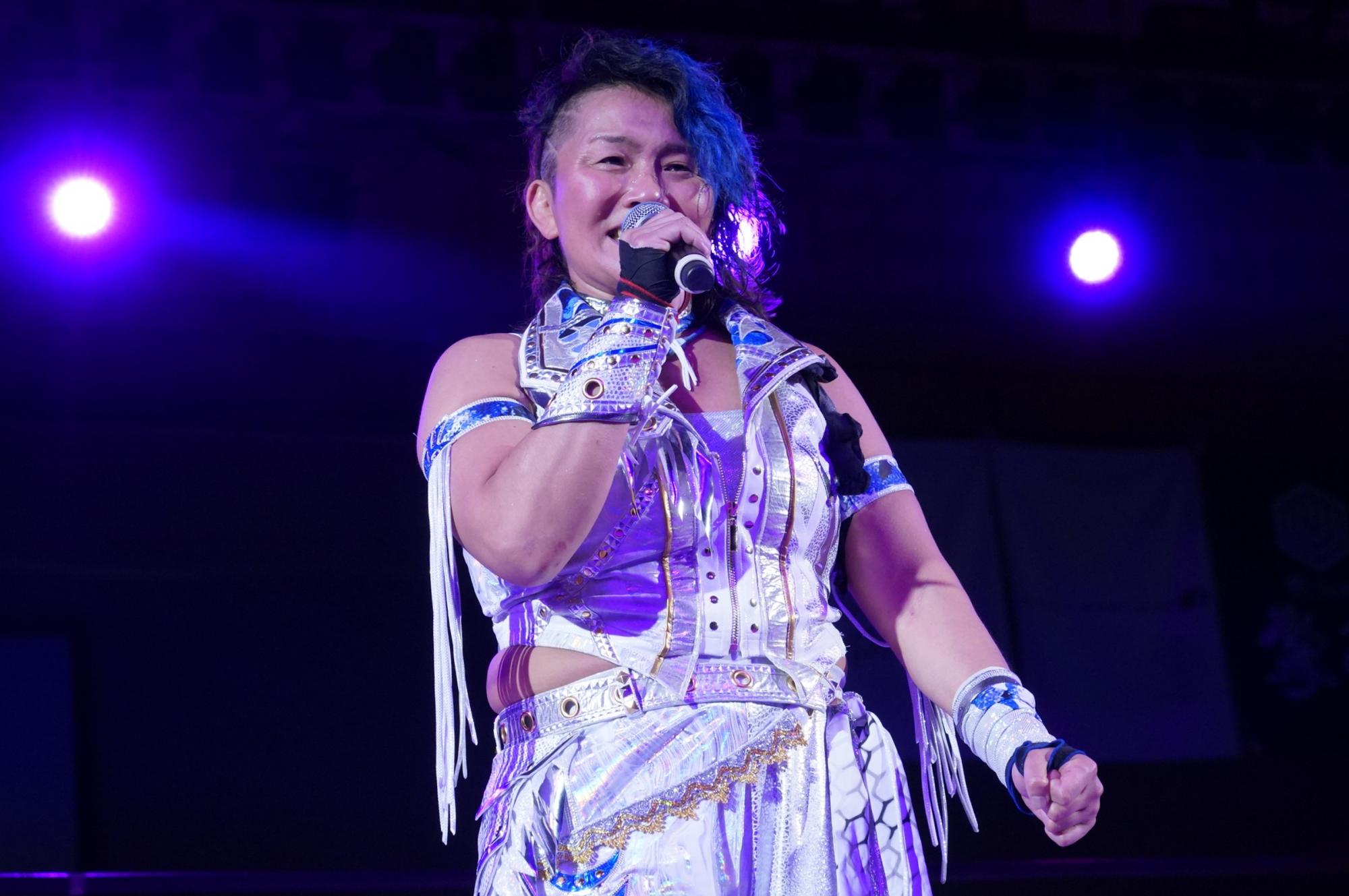 そしてメインイベントで加藤園子選手の引退試合が開催。対戦相手の水波綾選手は、加藤選手と同じ愛知県出身で、GAEA JAPAN時代には加藤選手が水波選手の教育係を務めていたという間柄。OZアカデミーではタッグを結成し、長年共に闘い続けました。レスラー人生最後の一戦に、会場からは“園子コール”が響き渡る中、加藤選手は『ドラゴンスープレックス』や『ダイビング・ギロチンドロップ』を決めるなど、激闘が繰り広げられました。この試合の解説を務めたのは、デビュー戦の相手でもある里村明衣子さん。デビュー当時の思い出も交えて、試合を見届けました。