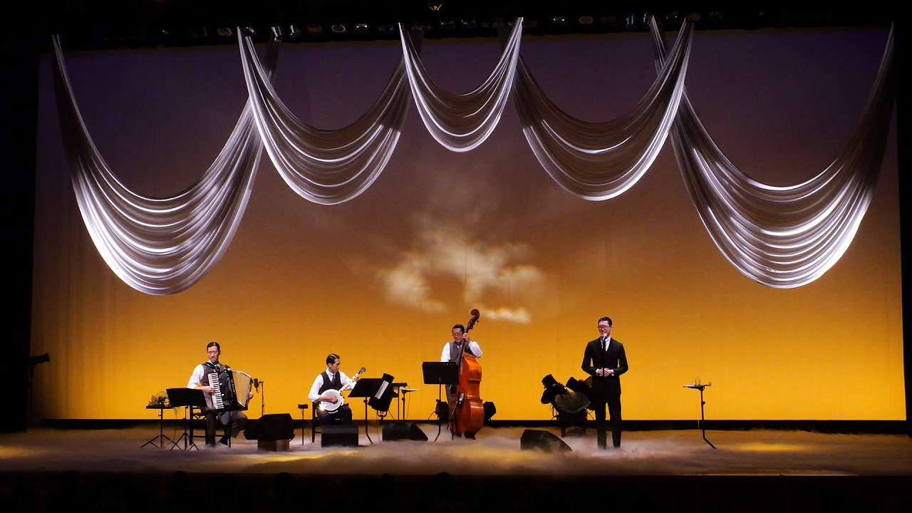 想い出の流行歌や昭和初頭の懐かしの名曲を、唄と演奏で届ける東京大衆歌謡楽団。メンバーは富山県出身の四兄弟で、長男・髙島孝太郎が唄、次男・雄次郎がアコーディオン、三男・龍三郎がウッドベース、四男・圭四郎がバンジョーを担当します。昭和の雰囲気を感じるヘアスタイルや衣装に身を包んで披露する、唯一無二の息の合ったパフォーマンスは、聴くものの心を掴みます。