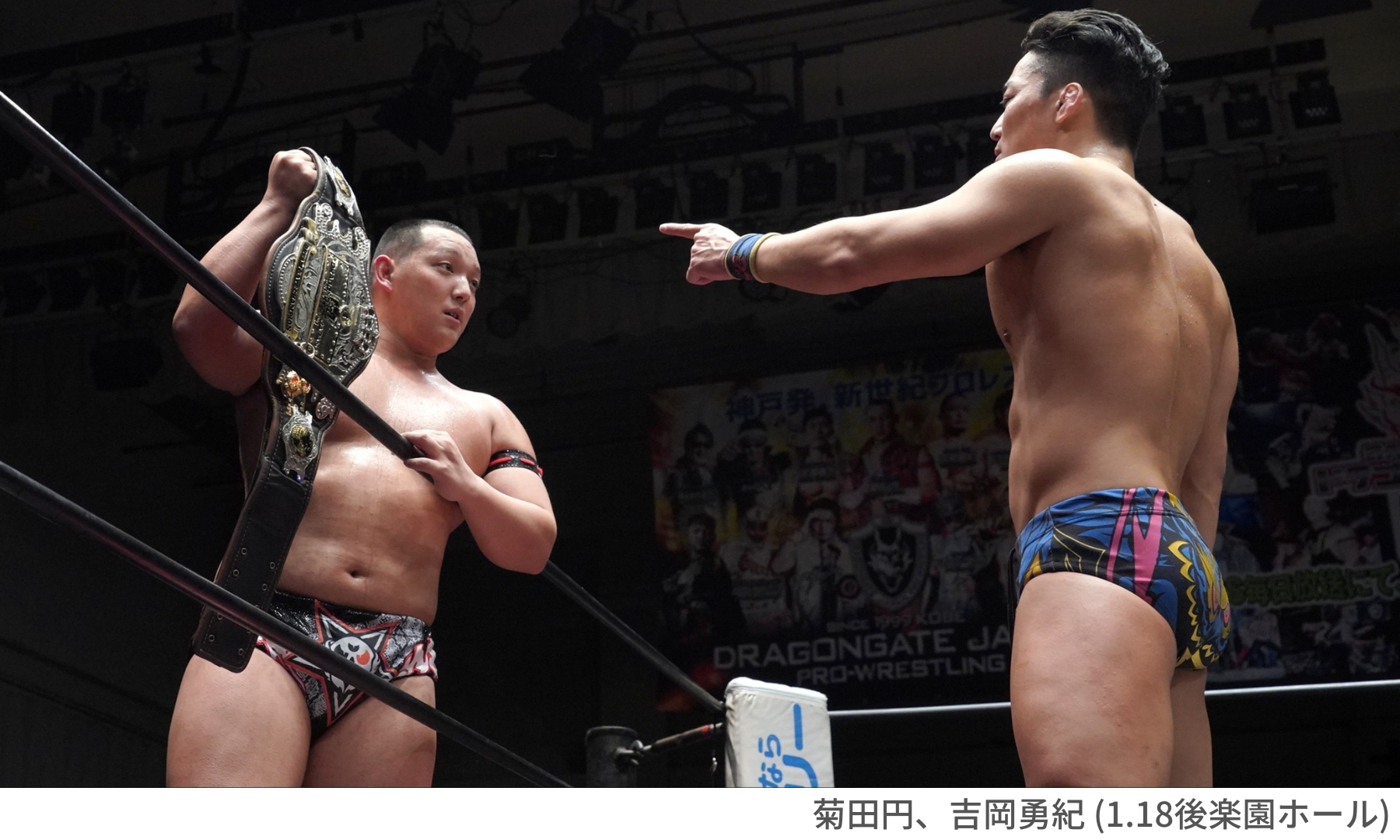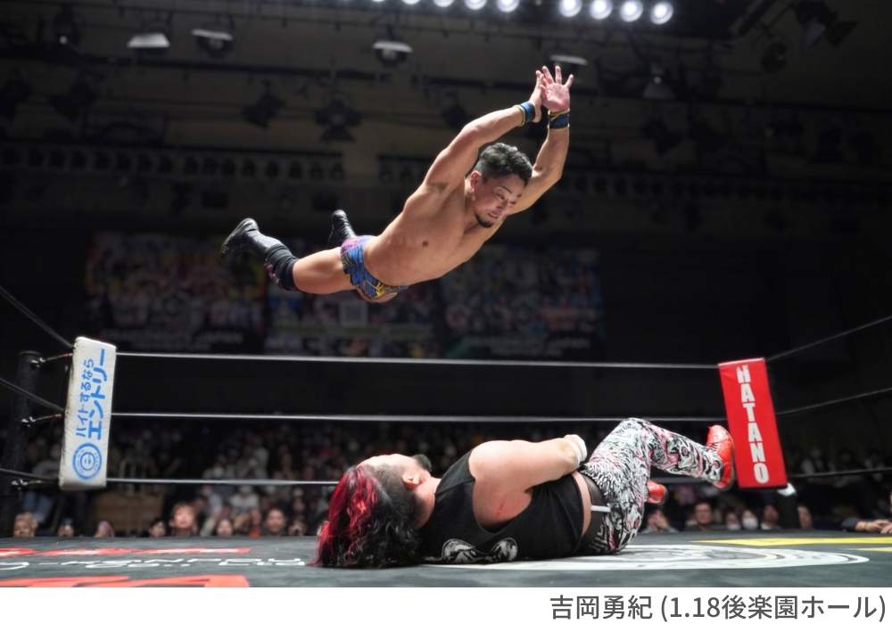 メインイベントは、DRAGONGATE最高峰のベルトをかけた「オープン・ザ・ドリームゲート選手権試合 《王者》菊田円 vs 《挑戦者》吉岡勇紀」。今年1月の後楽園ホール大会で、極悪ヒールユニット・我蛇髑髏(がじゃどくろ)を率いる現王者・菊田円選手に吉岡勇紀選手が挑戦を表明しました。吉岡選手は、新日本プロレスのエースとして活躍した、同郷の棚橋弘至さんから必殺技『ハイフライフロー』を継承し、この後楽園ホール大会でも同技を決めて勝利。