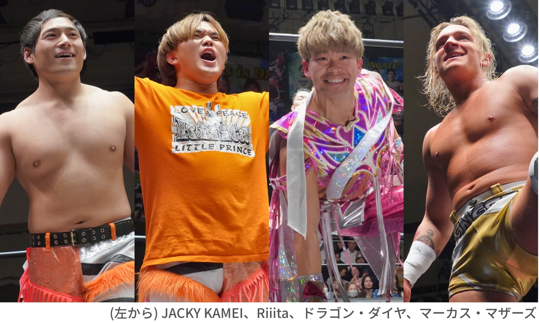 第5試合は、タッグの頂点を争う「オープン・ザ・ツインゲート選手権試合」。“ジャッキーリータ”こと、JACKY KAMEI選手とRiiita(リータ)選手による王者組に、ドラゴン・ダイヤ選手と今年1月からDRAGONGATEマットに参戦しているアメリカ出身のマーカス・マザーズ選手が挑みます。華麗な技の数々に注目が集まる一戦!