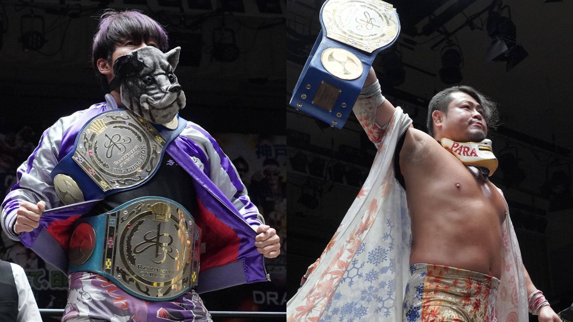 セミファイナルは、「オープン・ザ・ツインゲート/御万人王座「双琉王」W選手権試合」。DRAGONGATEのタッグ王座「オープン・ザ・ツインゲート」と、琉球ドラゴンプロレスリングのタッグ王座「御万人王座「双琉王」」の、2つのベルトを懸けて行われます。スピーディーな技で勢いを見せるツインゲート王者組の“ジャッキーリータ”ことJACKY KAMEIとRiiita(リータ)、キャリア20年を超えるベテランタッグ・双琉王王者組の横須賀ススムとKAGETORA、二冠を手にするのはどちらのタッグか!?