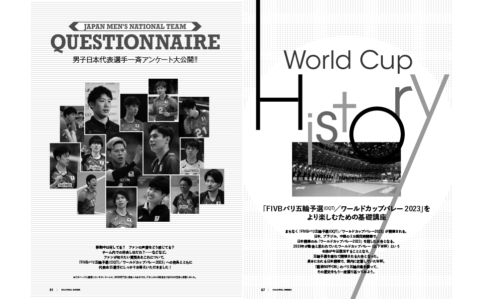 代表選手15名に一問一答のアンケートを実施。「移動中は何してる?」「ファンの声援をどう感じる?」「チーム内での仲良しはだれ?」などなど、ファンが知りたいと思う質問に回答していただきました。ほかにも1965年のW杯第1回大会からその歴史を振り返るページや、バレー初心者に向けた用語集なども掲載しており、男子バレーを総合的に楽しめるファンブックとなっています。