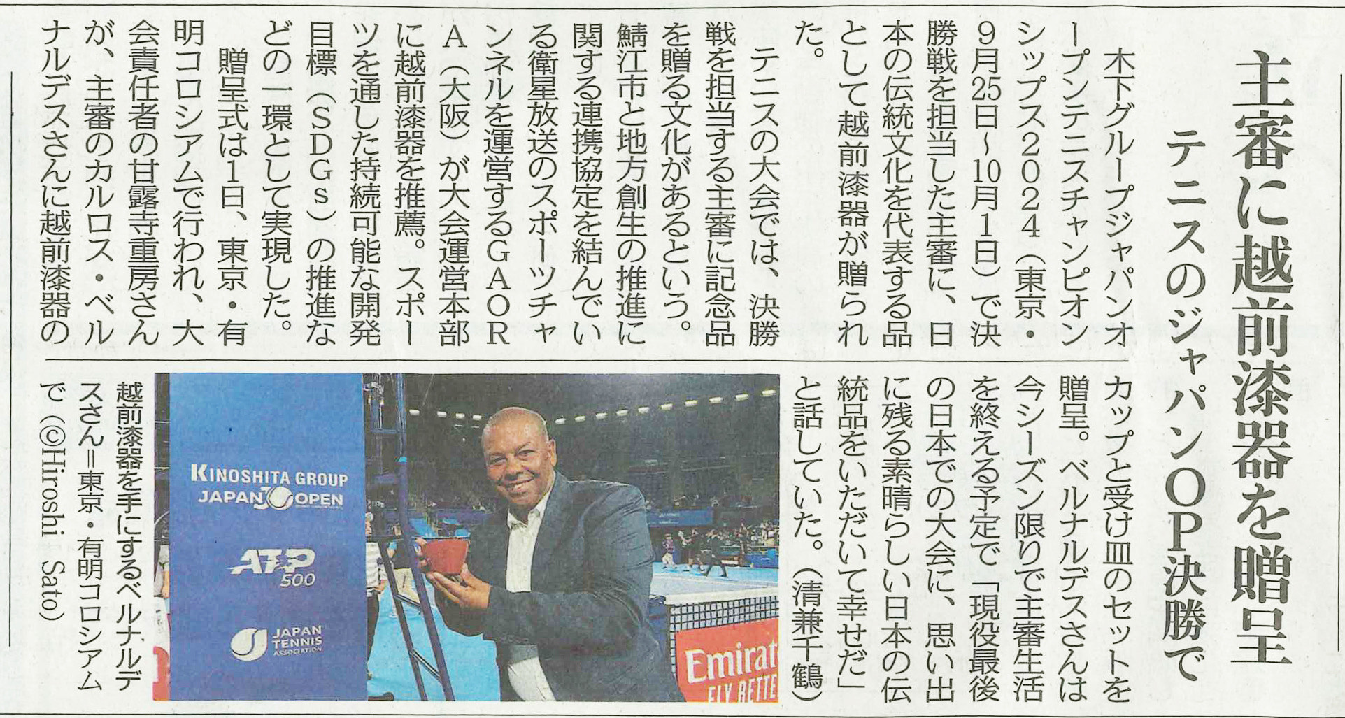 決勝でチェアアンパイア(主審)を務めたベルナルデスさんに日本の伝統工芸品「越前漆器」が贈られました
