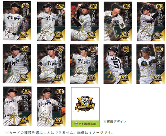 さらに、優勝特別展示に先駆けて明後日9月9日(火)から、甲子園歴史館にご入館の方、甲子園球場スタジアムツアーにご参加の方、または併設する「BE-STADIUM KOSHIEN」のご利用者を対象に、先着合計4万名様に優勝記念ロゴをデザインした全22種類の「優勝記念カード」を配布する。