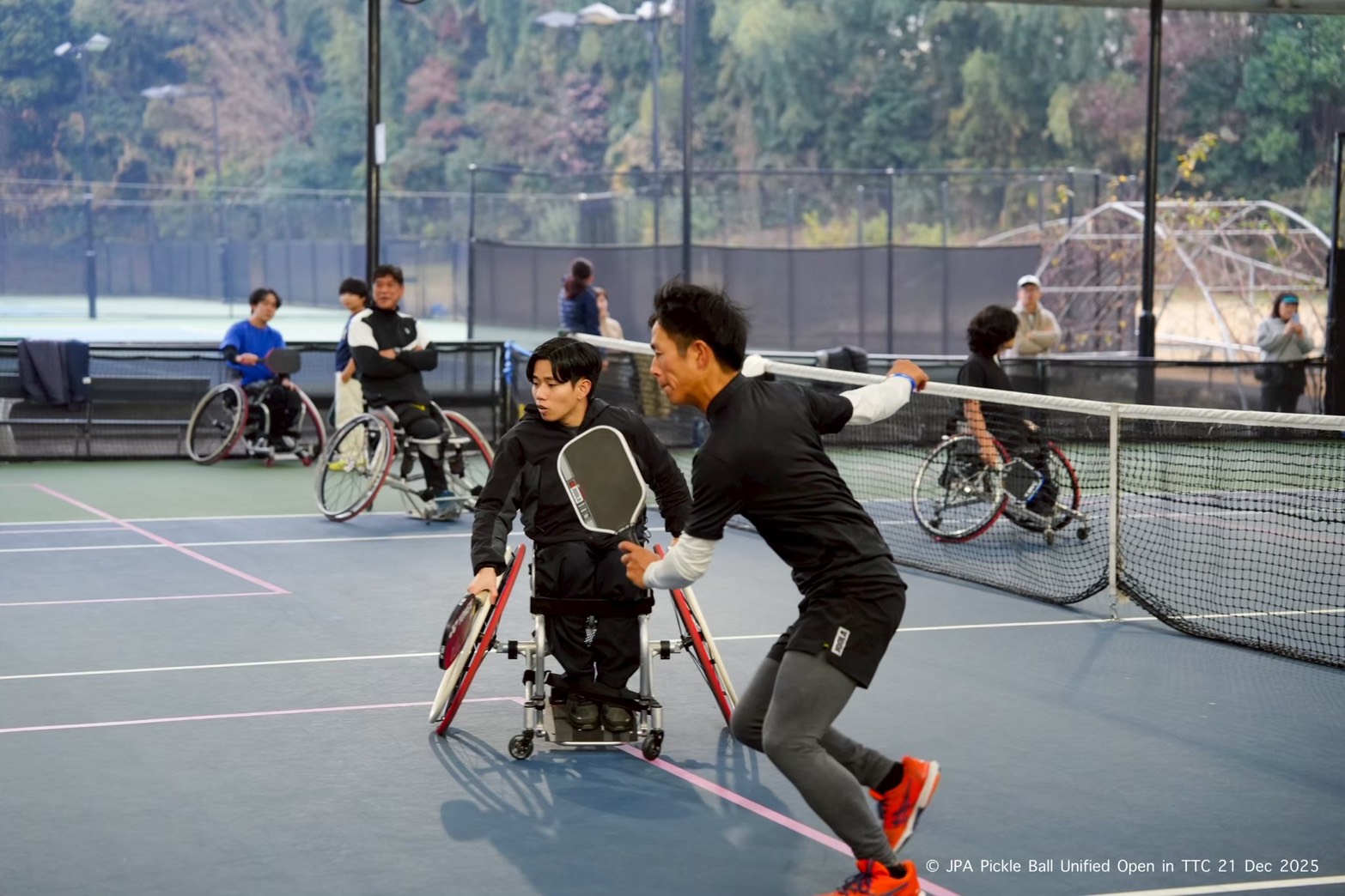 特に注目されるのが「車いすユニファイド」カテゴリーだ。これは車いす選手と健常者がペアを組んで対戦する種目で、立場を超えて協力し合い、誰もが同じコートで競い楽しめるインクルーシブな競技特性を体現している。