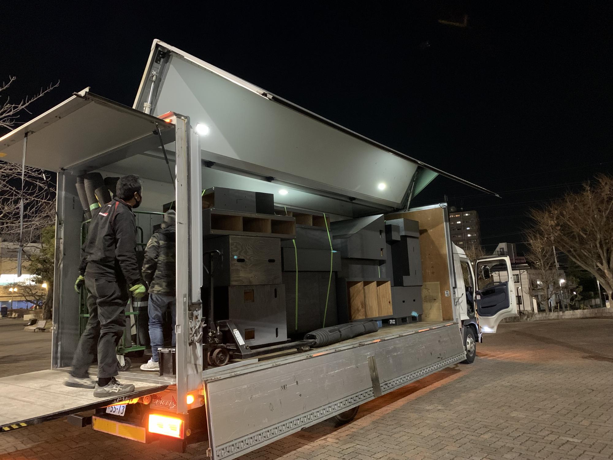 4tトラックに積まれて運ばれるキッズチェイスタグのコート