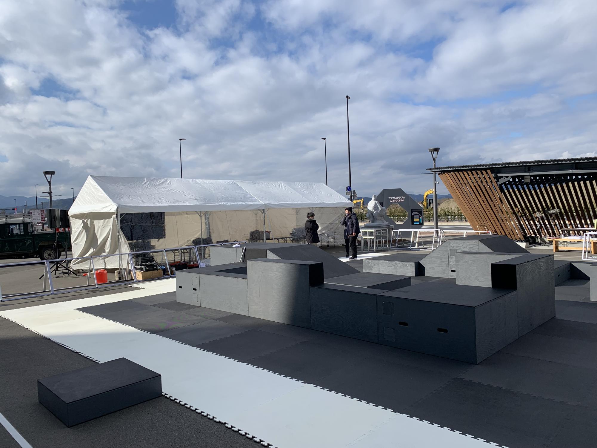 障害物のレイアウトやチェイサー台(画像左下の台)の設置場所を決めて、無事コートが完成