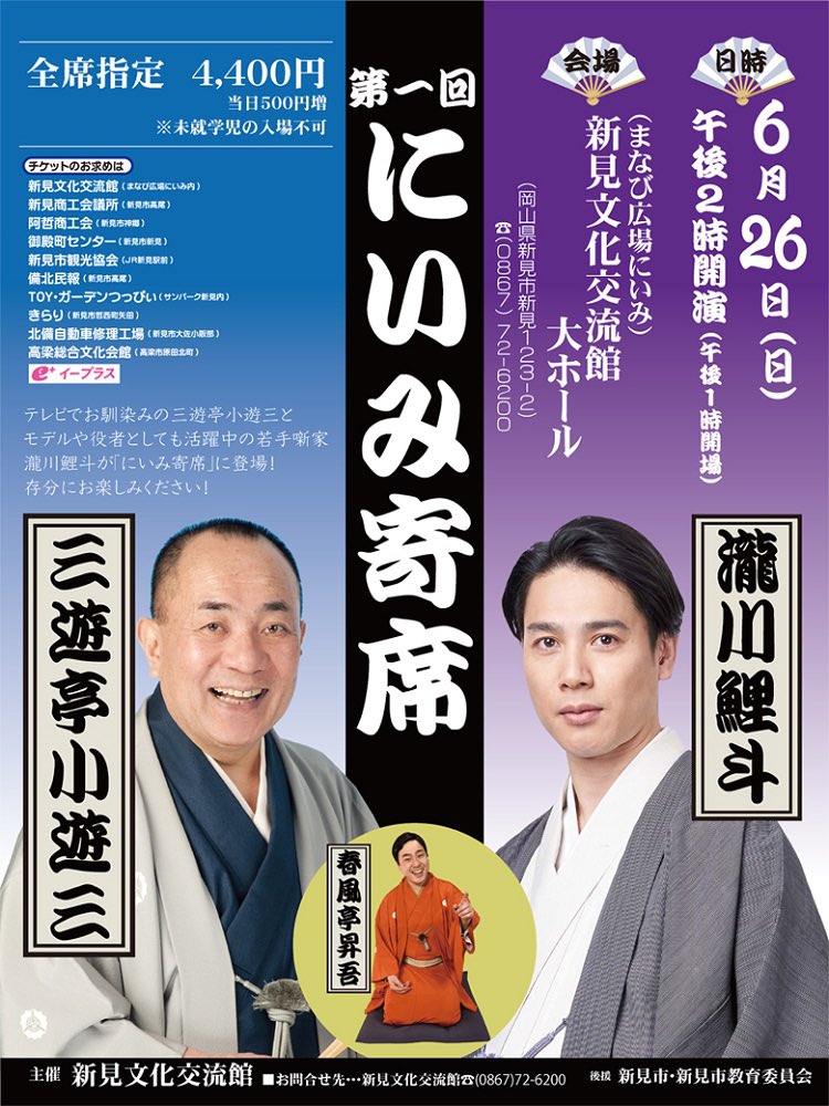 にいみ寄席 #イベント事業 #イベント事業 posted2022年6月1日 9時15分 2171views 0 この記事を印刷する 開催:2022年6月岡山県・新見文化交流館で、テレビでおなじみの三遊亭小遊三さんと俳優やモデルとしても活躍中の若手噺家・瀧川鯉斗さんを招き、「第一回にいみ寄席」として開催!おふたりはGAORAの人気番組「千客万来 がおら寄席」にご出演いただいた経緯から、今回のにいみ寄席のブッキングに至りました。有料公演にも関わらず、当日は多数のお客様にお越しいただきました。