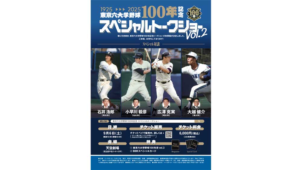 ベースボール・マガジン社は、100年を迎えた「東京六大学野球連盟」を記念して、春に引き続き、「東京六大学野球100年記念スペシャルトークショー第2弾」を9月6日(土)に天空劇場で開催することを発表した。 第2弾となる今回は1980年代の東京六大学野球を盛り上げた3人のスラッガー、石井浩郎(早大-近鉄ほか)、小早川毅彦(法大-広島ほか)、広澤克実(明大-ヤクルトほか)に加え、MCには大越健介(東大)を迎え、豪華布陣。 今回も来場者のみに「限定BBMカード(4枚1セット)」と8月5日発行予定の「東京六大学野球100年史vol.3」が特典として付き、野球カードファンにとっても貴重なトレカを入手できる絶好の機会となる。 ぜひスペシャルトークショーに来場し、レアグッズを手に入れよう! チケットはコチラから (日時)2025年9月6日(土) 12時 開場 13時 開演(会場)天空劇場( 東京都足立区千住1丁目4−1-21F)(チケット販売) https://www.ticketpay.jp/booking/?event_id=57050 (チケット料金)6,000円(2大特典付き)(特典) 東京六大学野球100年史 vol.3 BBMスペシャルカード(4枚1セット) 出演 石井浩郎[元早大] 小早川毅彦[元法大] 広澤克実[元明大 MC 大越健介[元東大]主催:ベースボール・マガジン社/協力:東京六大学野球連盟お問い合わせ:ベースボール・マガジン社 03-5643-3927(平日11:00~18:00)(注意事項)●講演内容は予告なく変更される可能性がございます。予めご了承ください ●チケットの不正転売は固く禁止されています●当イベントにおける録音・録画・撮影等の行為は一切禁止です。 また、録音・録画撮影等を目的とした機器の会場への持ち込みもご遠慮いただいております●場内にクロークのご用意はございません